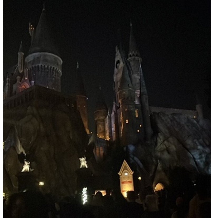 We walked towards the lights however it led us to a dark space. We though we were outside of the theme park until we reached the end of the tunnel and realized it led us to Harry Potter's World. There were a lot of stores that people could shop out of. There was a large dragon on one of the buildings as well.