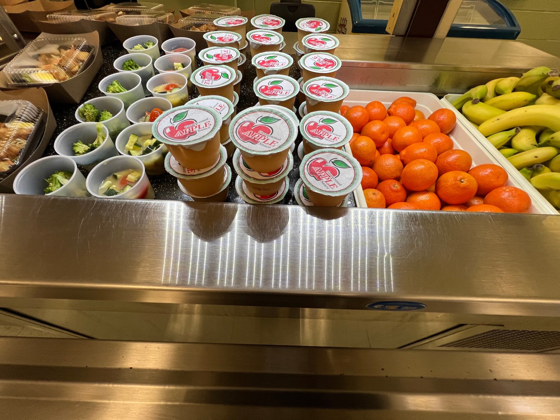 Monday's cafeteria food: wings with rice and a dinner roll or a chicken sandwich, fruit, veggies.